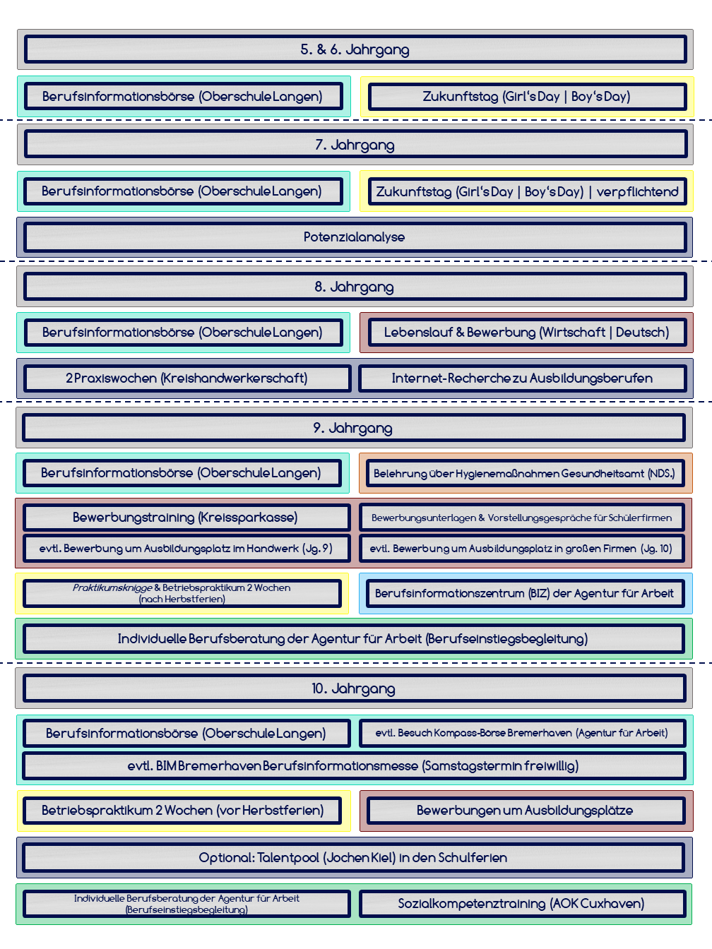 Erläuterung der Farben: Berufs- und Ausbildungsbörse | Praktika | Interessen & Kompetenzen | Bewerbung | Berufsinformationszentrum BIZ | Beratung | außerschulisch erworbene Kompetenzen