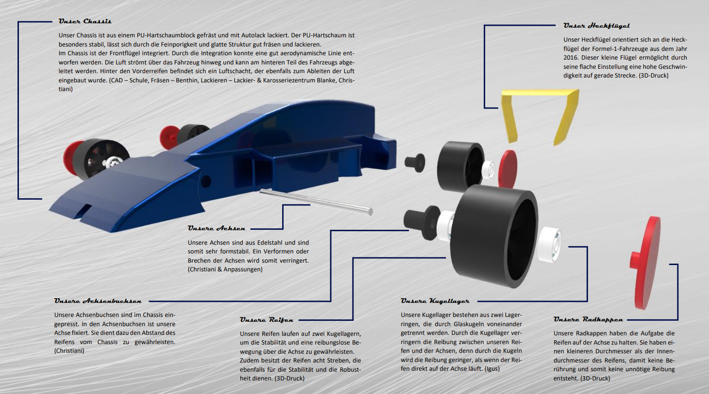 Felix hat das Auto mit dem Programm „Solid Edge“ gezeichnet. Er hat in den meisten Stunden produktiv das Auto gezeichnet (konstruiert) und Verbesserungen von uns und der Außenstehenden angenommen und umgesetzt. Hierbei achtet er auf die Aerodynamik, Formgebung und Stabilität des Rennwagens. Er hat zudem Reifen (mit Felgen) und den Heckspoiler konstruiert und seine ganze Kreativität im Auto verwirklicht. Zudem ist er für die Probedrucke von Rennwagen, Heckspoiler und Reifen verantwortlich.