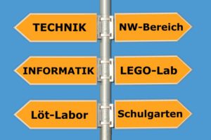 HIER geht’s zu den Technik-Räumen. HIER geht’s zum LEGO-Lab. HIER geht’s zum Löt-Labor. HIER geht’s in den NW-Bereich.