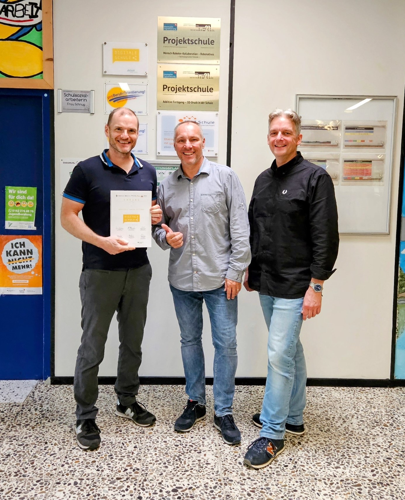 Schulleiter Jan Lückert konnte zusammen mit dem Didaktischen Leiter Michael Bergmann und dem Koordinator für digitale Medien Markus Christoph die Auszeichnung entgegennehmen.